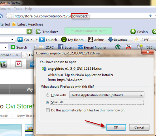 1. Choose the game you want to download, hit Download. When the Firefox download window appear, choose Open with. You can open the jad file with notepad or Microsoft Word. (I recommend Microsoft Word because it is easier to find the download link). After that, click OK.
